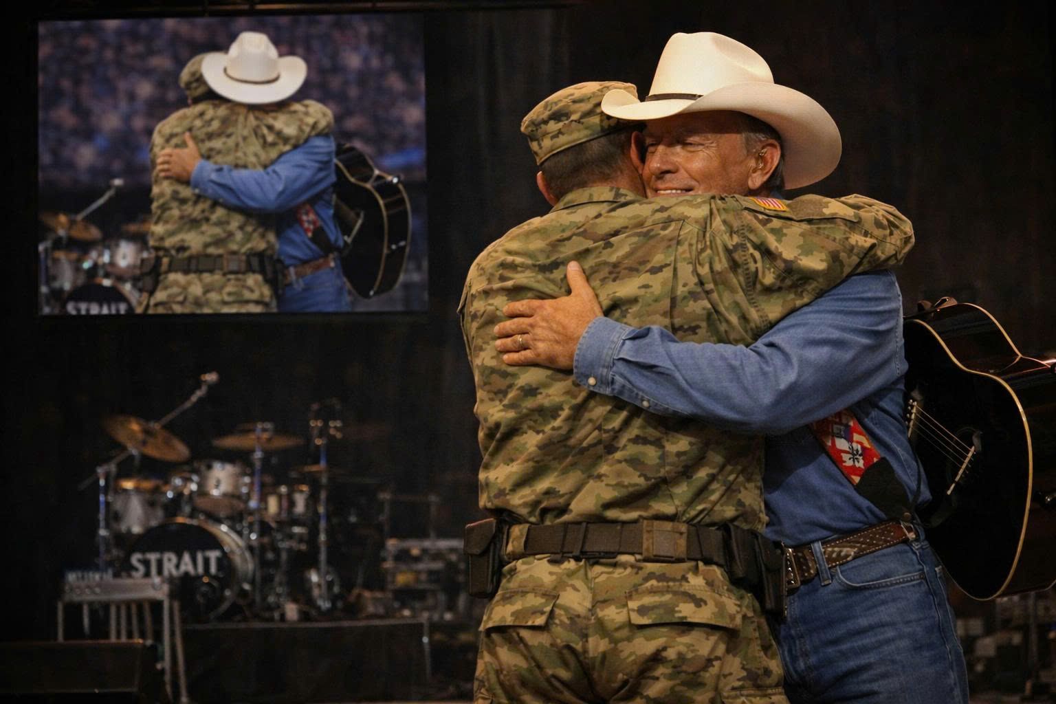 In the middle of a night already overflowing with cheers, camera flashes, and the familiar electricity of a sold-out arena, something unexpectedly quiet transformed the entire room. George Strait was deep into his set, moving effortlessly through songs that had soundtracked decades of lives, when his eyes caught a single figure standing motionless in the farthest row. A young soldier, dressed in a worn military uniform, stood with his hand raised in a steady salute. It wasn’t theatrical. It wasn’t meant to draw attention. In fact, most people never noticed it at all. But George did. And in that instant, instinct overrode routine. Without warning, the music stopped. The roar of the crowd dissolved into a puzzled hush. There was no announcement, no explanation, no attempt to frame the moment. George simply asked the soldier to come closer. Slowly, almost hesitantly, the young man walked toward the stage, uncertainty written across his face, eyes locked on the man whose voice had carried him through places most people never see. What followed was not spectacle or applause. George removed his guitar—the same instrument that had filled arenas, carried stories, and earned its place in music history. He signed it quietly and placed it gently into the soldier’s hands. The room seemed to forget how to breathe. Then the soldier spoke, his voice shaking: “Thank you for bringing me home safely.” Tears followed, not only from him, but from the audience as the weight of the moment settled in. This wasn’t about celebrity or performance. It was about survival. Only then did the truth emerge. During long nights on the battlefield, when fear pressed in and silence became unbearable, George Strait’s songs were the only sound coming from a battered old radio. They weren’t background noise. They were lifelines—reminders of home, of normalcy, of a future beyond the chaos. Those songs didn’t just comfort him; they steadied him. They helped him endure. George didn’t respond with words. He didn’t need to. He reached out and held the young man’s hand. Two men standing together. Two very different battles behind them. One shared heartbeat of gratitude filling the space between. And in that rare, unguarded moment, the crowd didn’t cheer. They witnessed something deeper—a reminder that music can travel farther than any stage, and that true gratitude never needs a script.